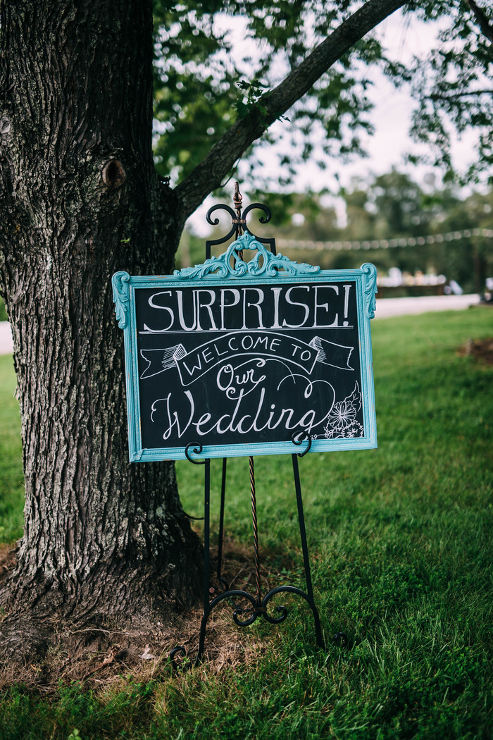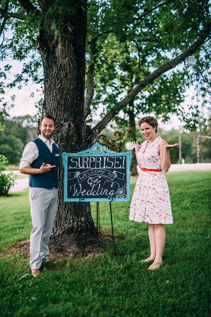 We enjoyed greeting our guests with a sign reading: “Surprise! Welcome to our wedding!” I wore a casual dress to greet guests so there was still a “reveal” of the wedding dress when I walked down the aisle. My best friend flew in from Paris and was ordained online so that she could be our officiant. She delivered the best ceremony I’ve ever heard – personal, poignant, and funny!