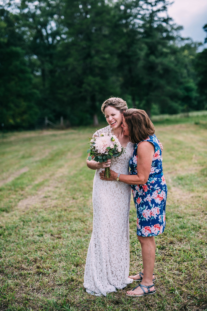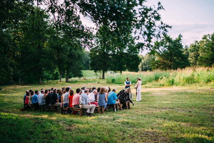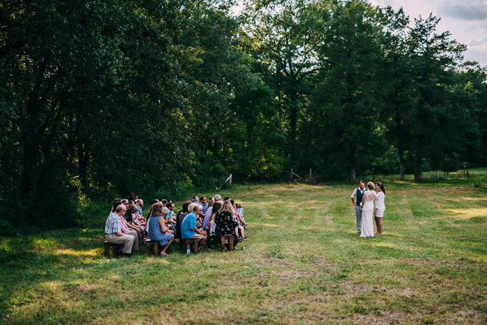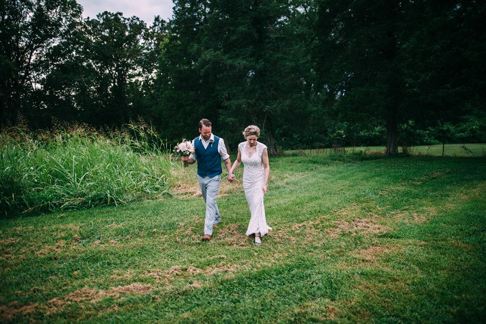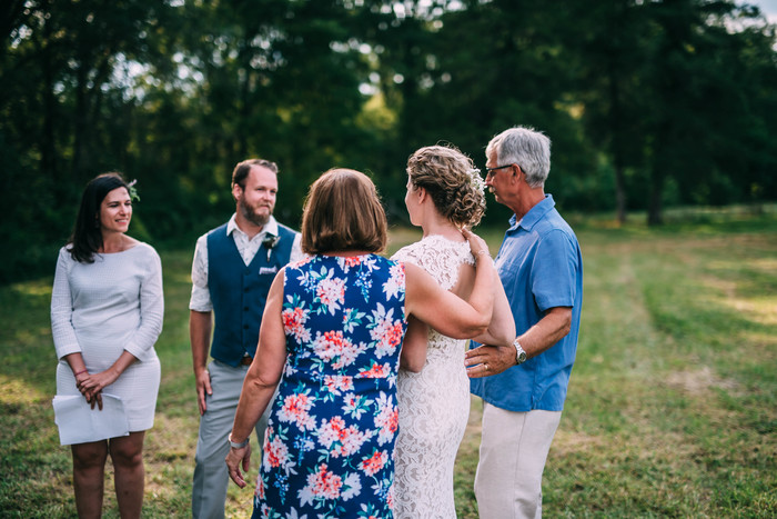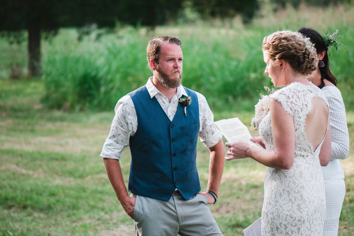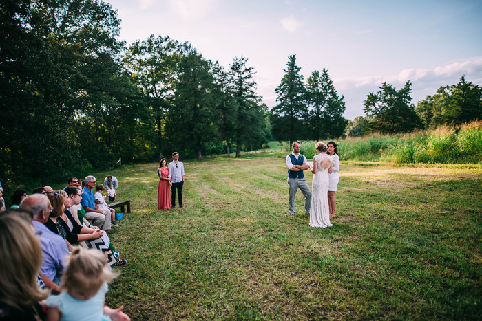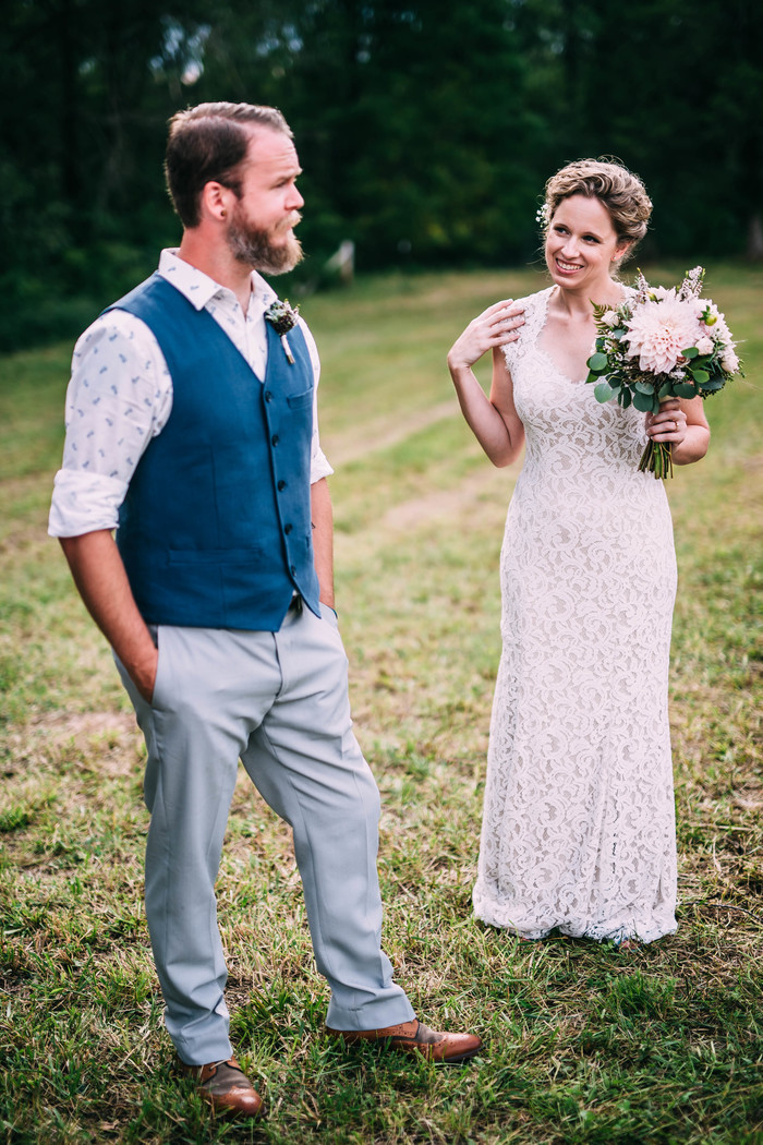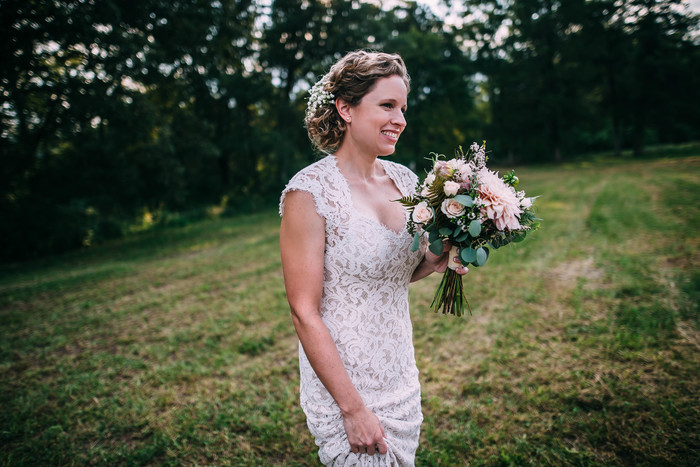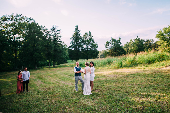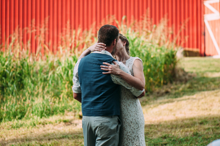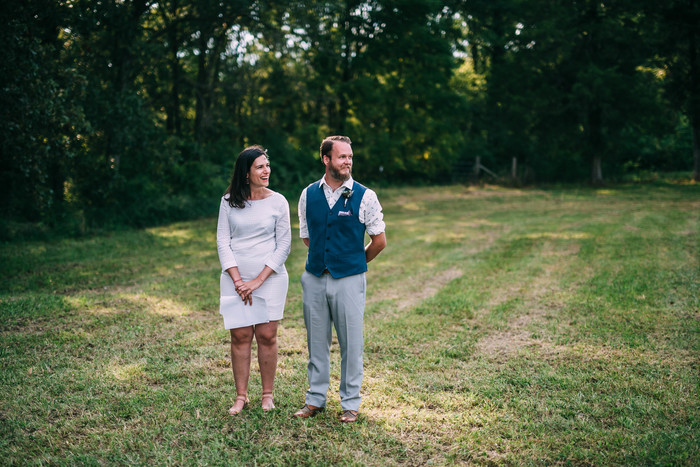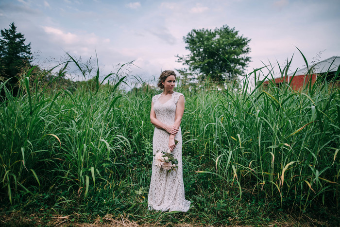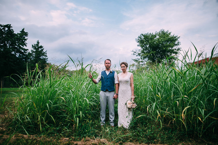 It is so easy for a wedding to spiral out of control and become something bigger than the couple wished. Justin has a huge extended family; inviting extended family, parents’ friends, etc. would have put the guest list at 200 people. The farm could never host that many people, so we would have ended up at venue that wasn’t “us.” We invited everyone to an engagement party … We didn’t want color schemes, monograms, chair covers, bridal showers or pre-wedding parties. We decided the best way to keep the wedding small was to make it a surprise wedding. I was still able to involve my mom in the planning of a party, but we didn’t tell my parents until about two weeks before the wedding when we couldn’t come up with an excuse to mow an aisle into the field. Justin didn’t tell his family until the night before. Some of our family and friends suspected something was up, but the surprise factor allowed us to stay true to our vision of the day.