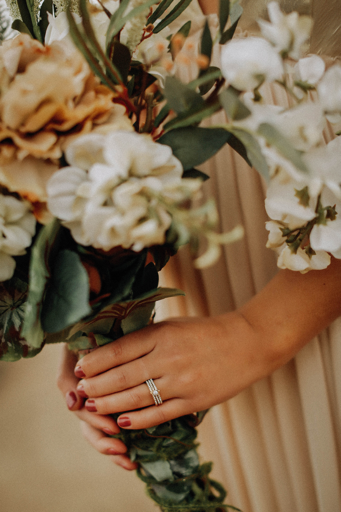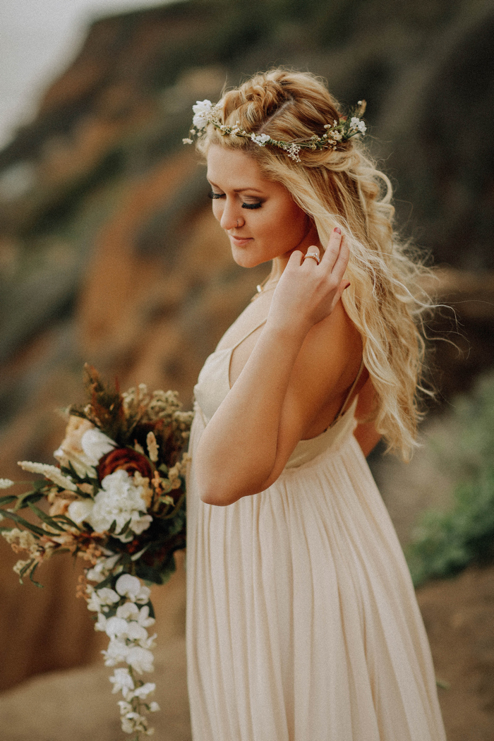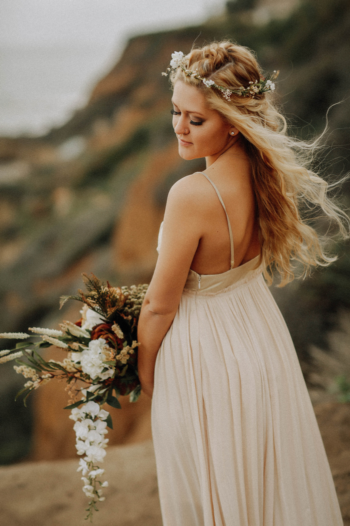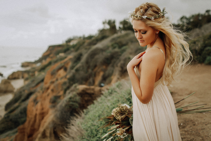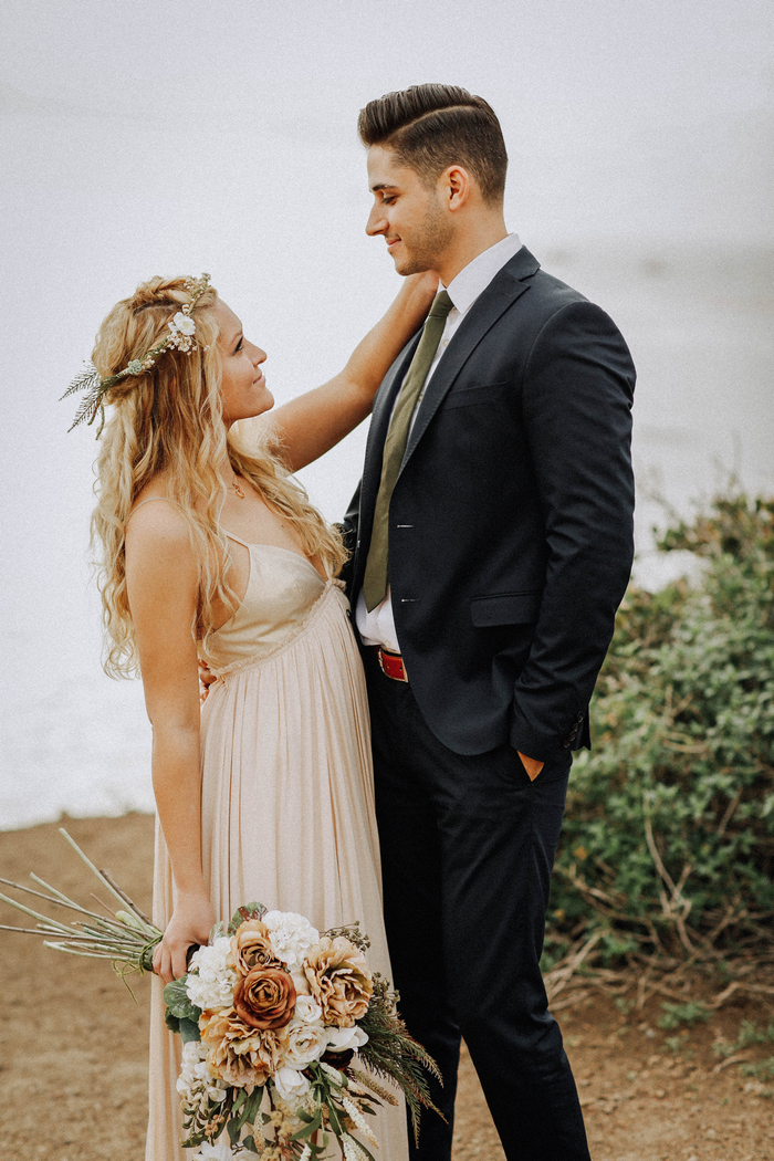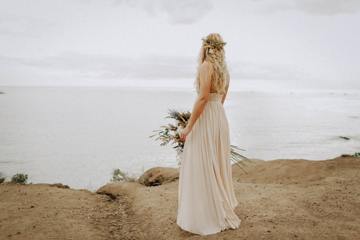 “I wanted to stylize a beachy, romantic, and intimate elopement on a budget. I wanted it to feel as authentic as possible without looking too editorial. The bride is naturally a very beach-vibe kind of gal, so finding a dress that suited her personality was important to me. We found her gown at Free People, and the groom’s suit at Zara. To save money, I styled the head crown and bouquet myself. These are two things I’d never done before, but I had so much fun playing around with different flowers and plants, I considered becoming a florist for a hot minute.