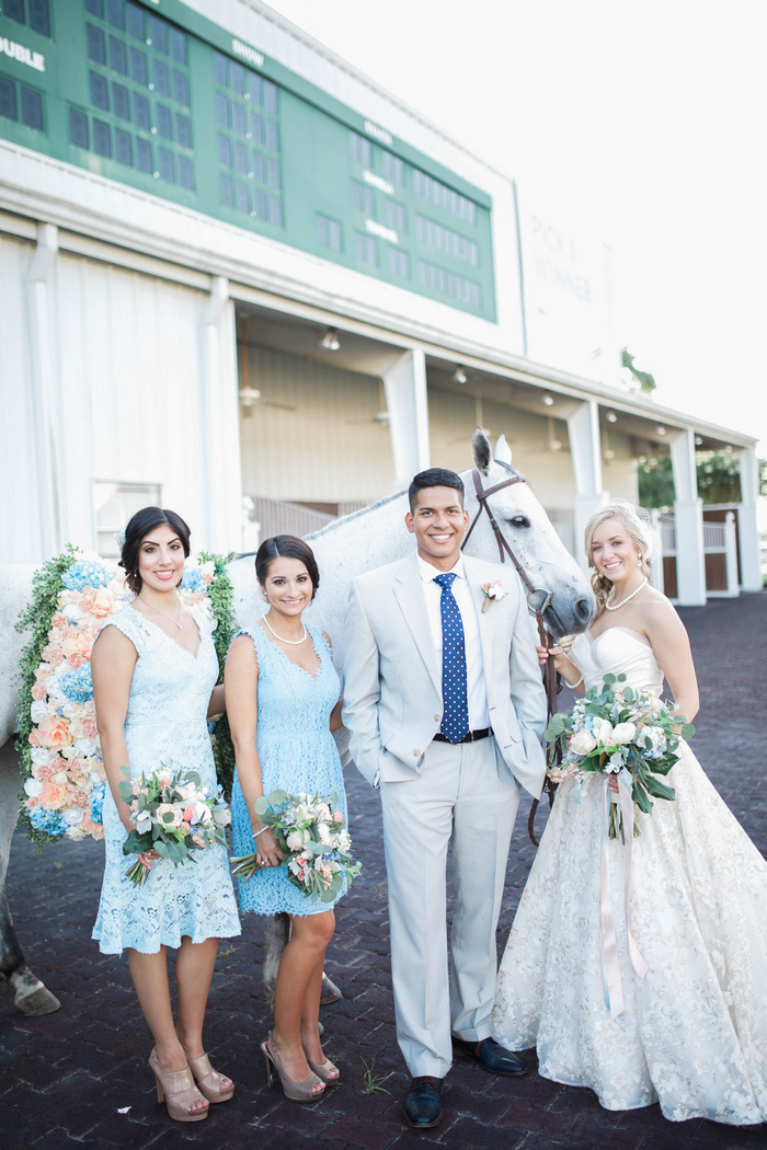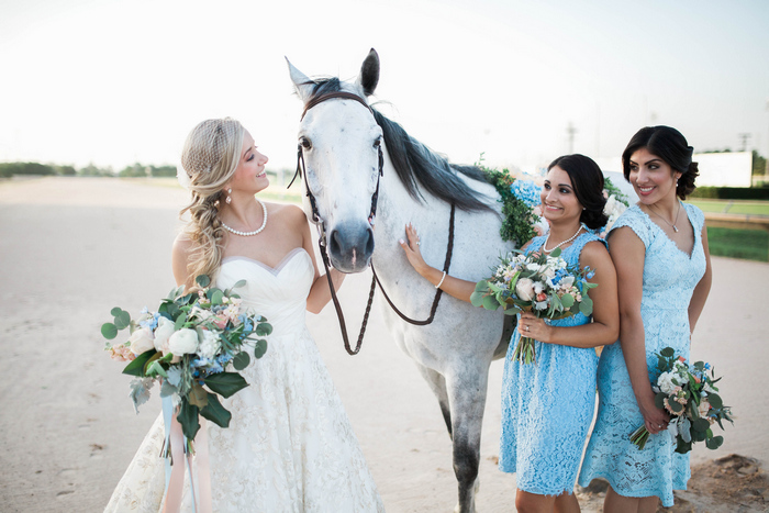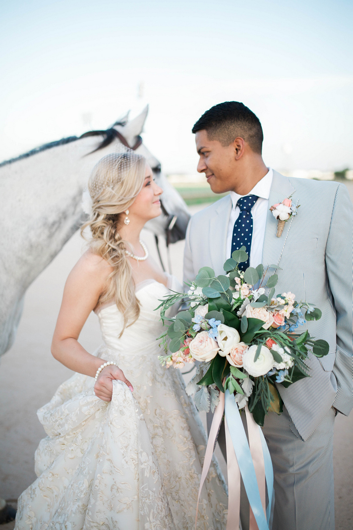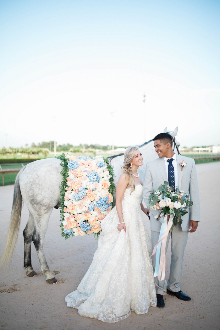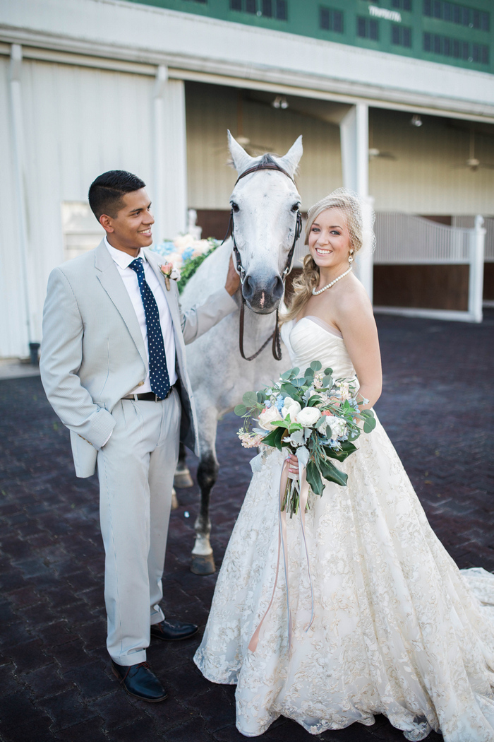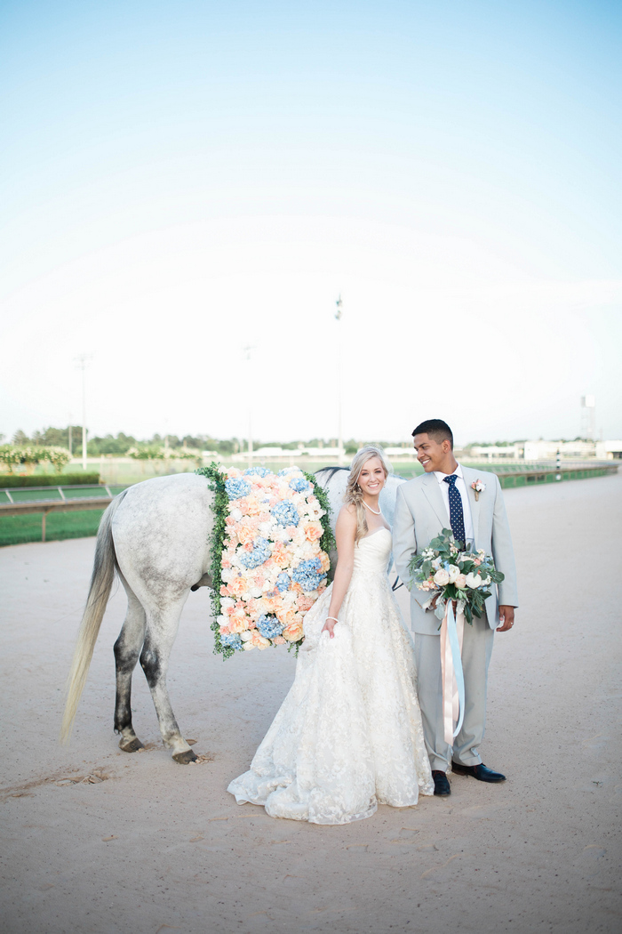 “When it came time to select a venue for their summer wedding, the bride and groom knew they wanted to share their love of the Kentucky Derby with their guests. The Sam Houston Race Track made for the perfect backdrop to document their love story – showcasing the bride’s own horse, Diesel, as a big part of the wedding day celebration. They toasted with mint juleps while dancing the night away on the dirt track surrounded by family and friends, reminding them of where their own love story got started.”
