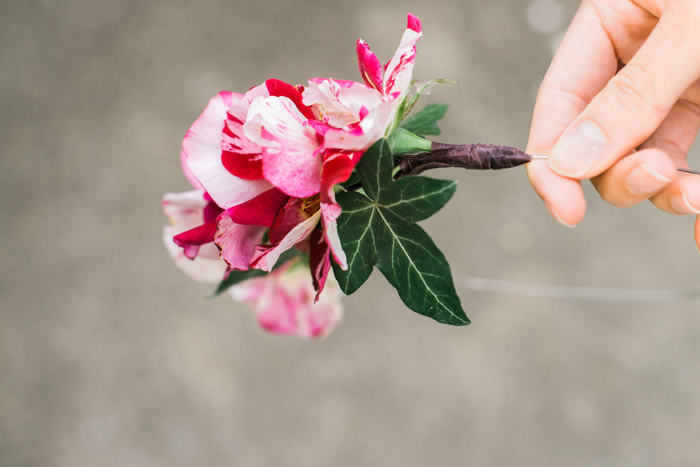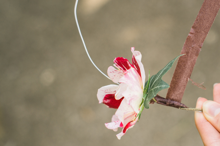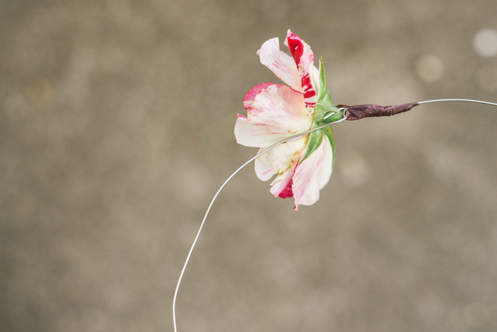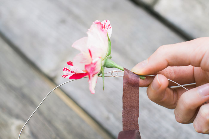 Continue wrapping the flowers and greenery, alternating them until the entire wire is covered.