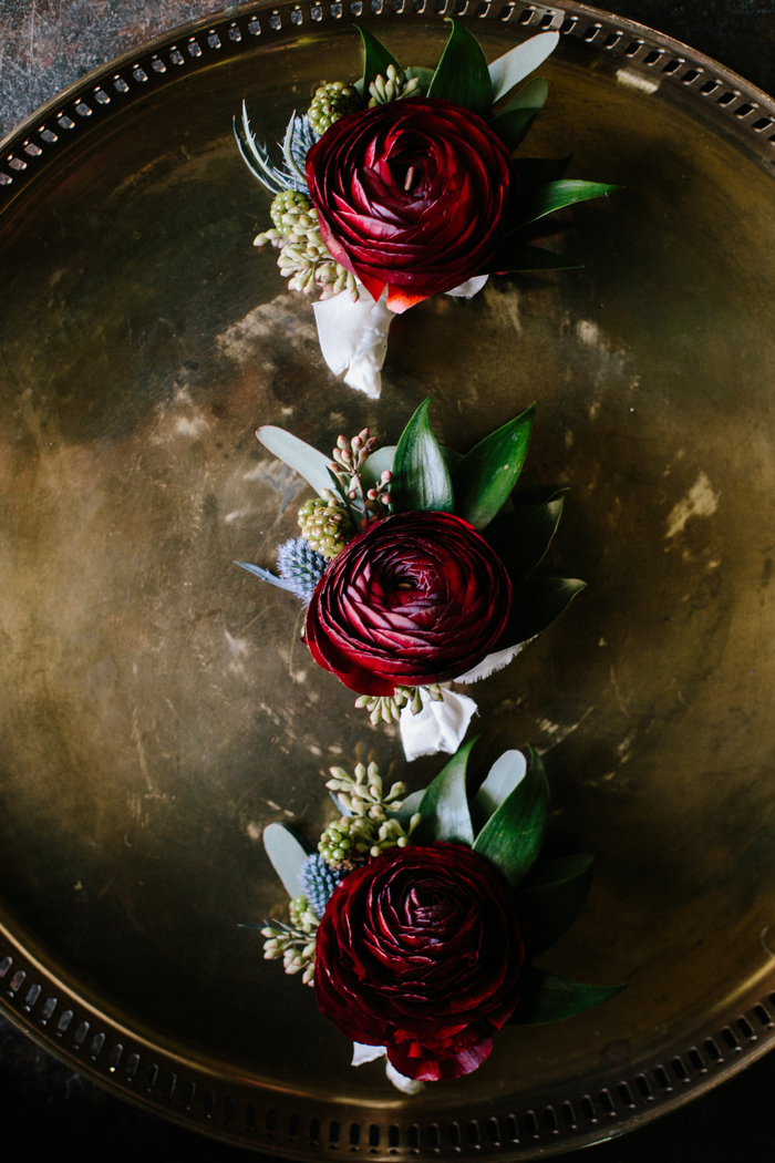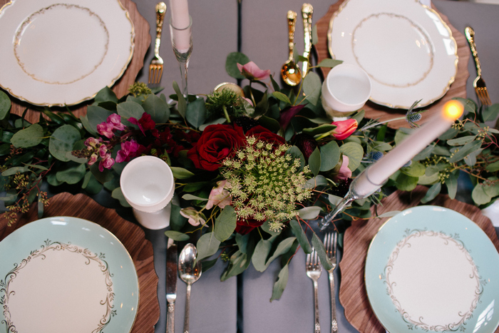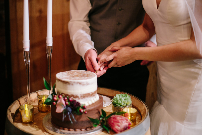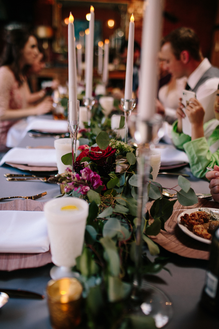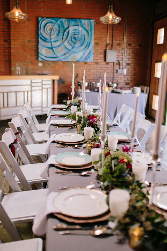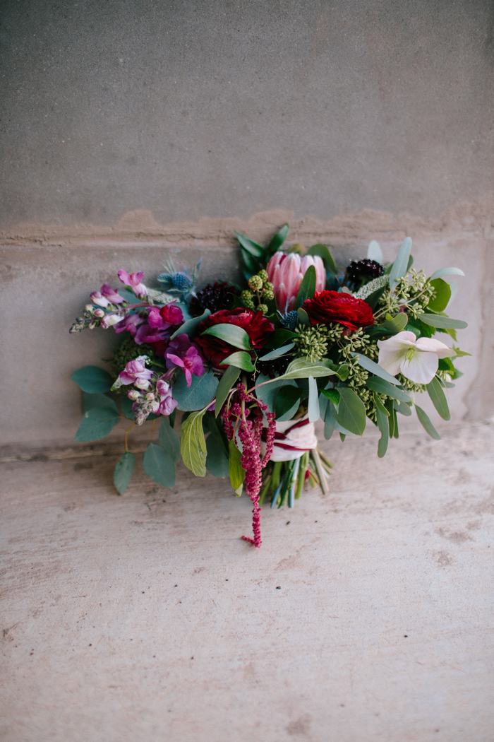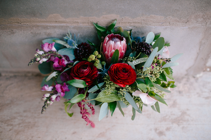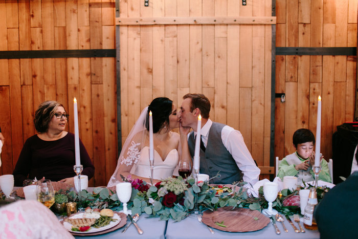 For their wedding venue, they chose the eclectic and intimate McPherson Cellars. Embracing the texture and dramatic atmosphere of the small winery, Janet choose a moody and romantic color palette of gray, navy, burgundy, and red. She and Jessica Ormond Events worked together to create a candle-lit ceremony and dinner with lush bohemian inspired florals. Blending spring flowers such as Ranunculus, Hellebores, and Clematis, with textural elements such as Protea and Succulents. Candles were used liberally throughout the ceremony and reception. Vintage dinnerware from Attic Vintage Rental Co added another layer or romance and softness while the wood chargers echoed the wood accents of the venue.